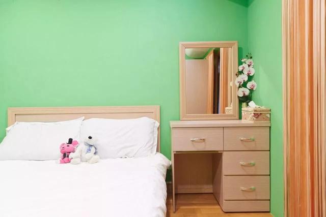對(duì)于臥室面積較小,然后又想放兩個(gè)床頭柜的業(yè)主,不妨可以把梳妝臺(tái)放在電視墻,與電視柜平齊排放;