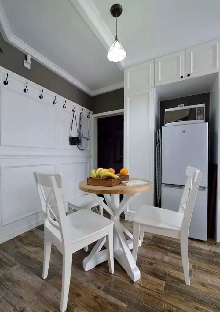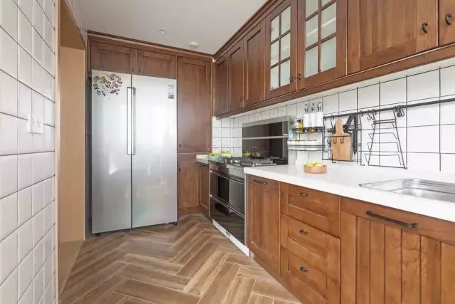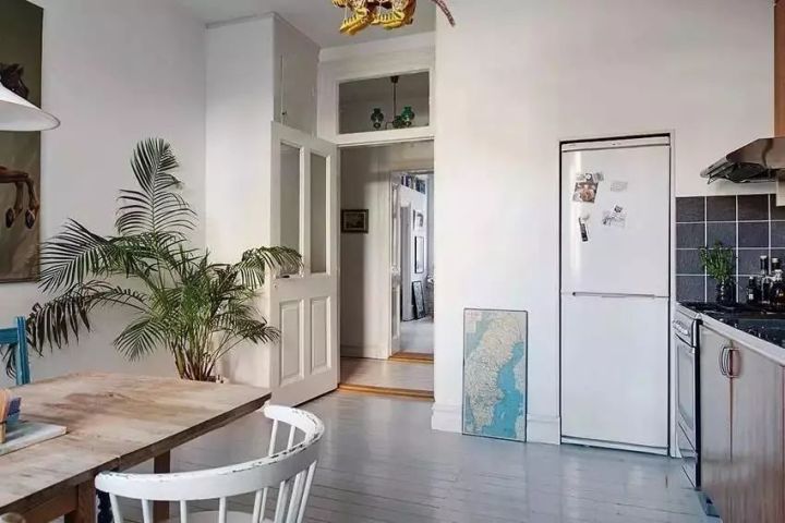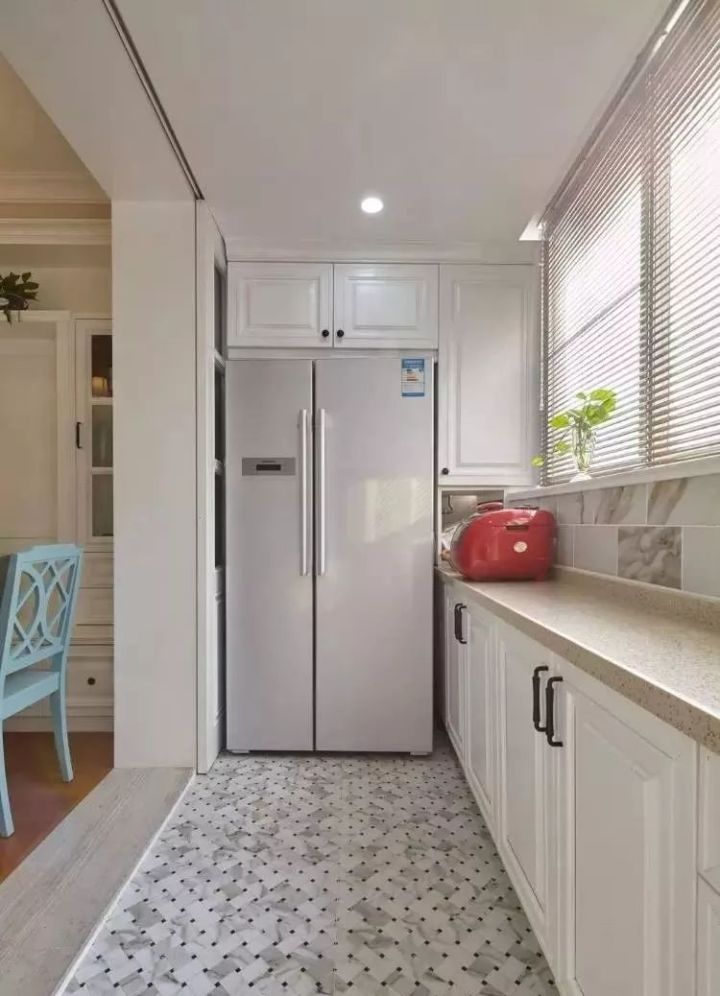 就是直接把冰箱放在廚房的某個(gè)預(yù)留區(qū)域,就像下圖一樣,這種情況冰箱基本是獨(dú)立占據(jù)一個(gè)區(qū)域,與櫥柜沒(méi)有什么關(guān)系,處于“裸奔”狀態(tài)。