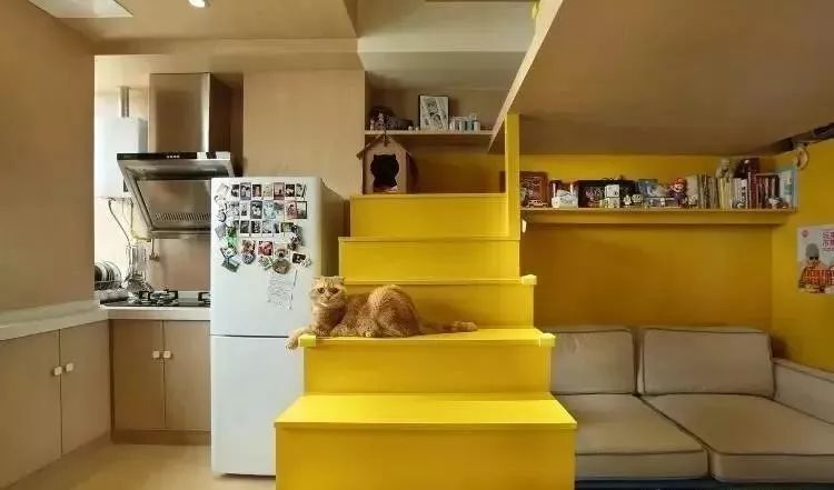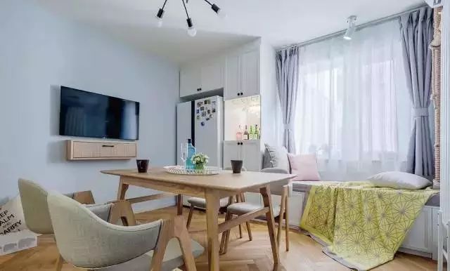 冰箱與柜體合為一體,相當(dāng)節(jié)省空間??看暗牡胤降淖隽藗€(gè)榻榻米,等飯之余,靠著讀幾頁(yè)書(shū)也是挺不錯(cuò)的。